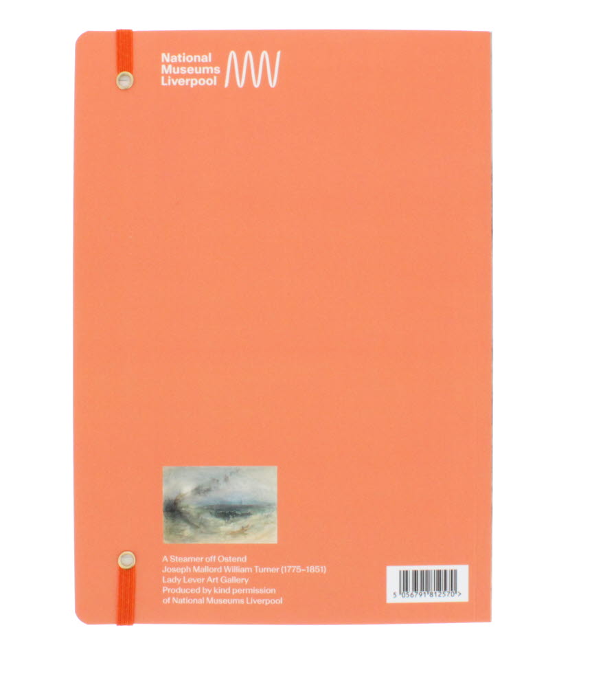 The journal is filled with lined paper and has a contrasting orange elastic closure. The journal has been designed and made in the UK for National Museums Liverpool.